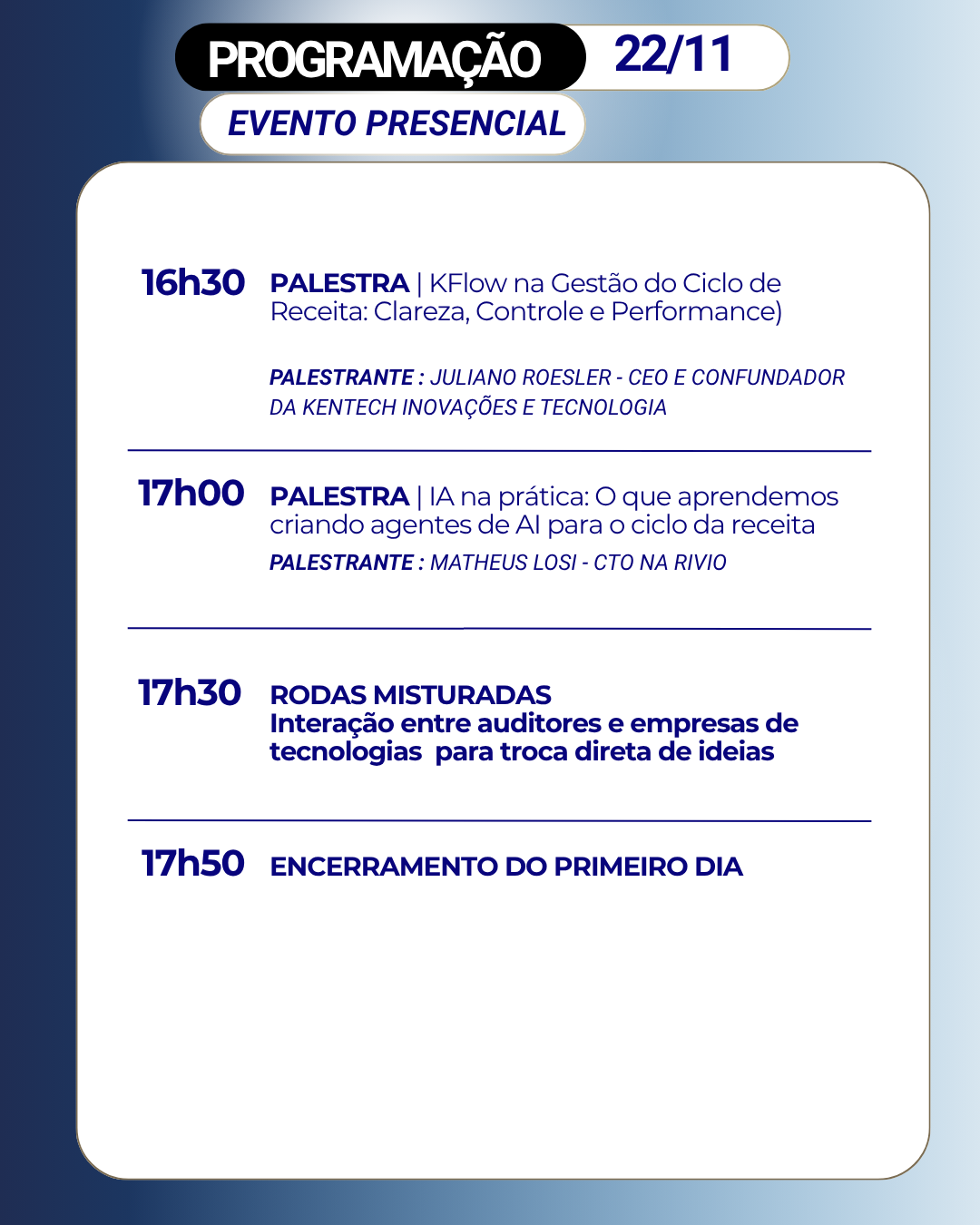 O congresso de inovação e tecnologia é uma oportunidade incrível para conhecer as novidades aplicadas de tecnologia na auditoria, prático, aplicável e com muita oportunidade de melhoria nos nossos processos! A interação com os participantes e o networking são benefícios incalculáveis!