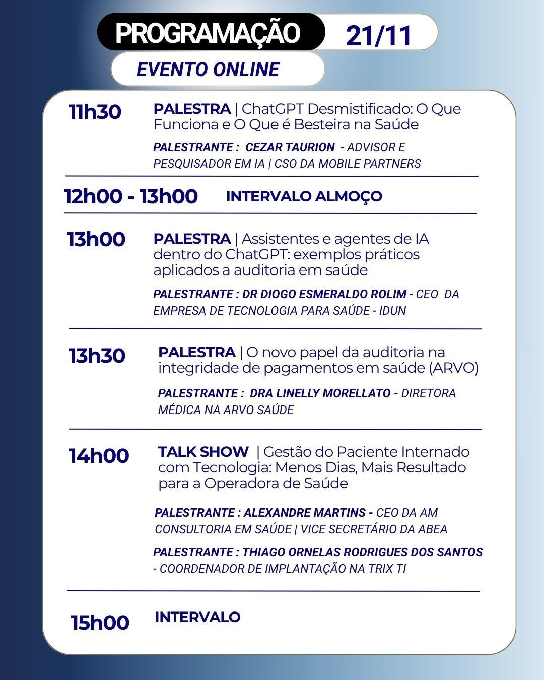 Atua na gestão de auditorias de contas e concorrente com grandes operadoras com foco no uso de tecnologias, automação e interoperabilidade (FHIR) aplicadas à auditoria médica.